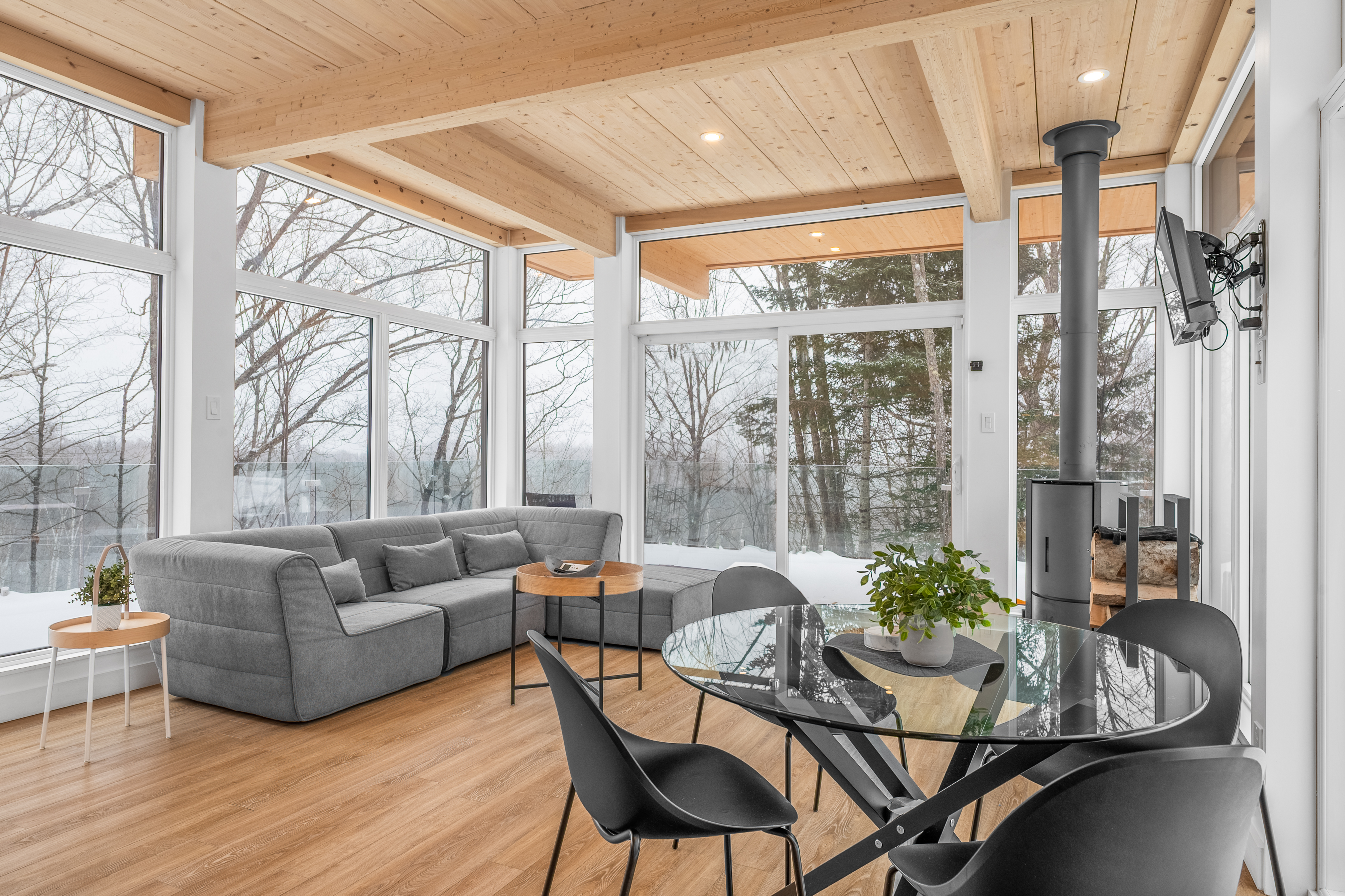 La Forêt Boréale se trouve à 10 minutes du centre de ski Le Mont-Tremblant. Le chalet est entouré d’une magnifique forêt et les grandes fenêtres ont été pensées pour maximiser le spectacle.